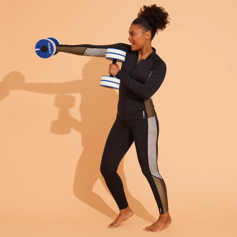 Notre équipe de conception a développé cette veste aquatique zippée pour les femmes pratiquant l’aquagym ou l’aquabike.Vous souhaitez vous couvrir le haut du corps pendant votre cours d’aquabike ? Optez pour la veste aquatique avec résistance au chlore et zip sur l’avant pour faciliter l’enfilage et le désenfilage.